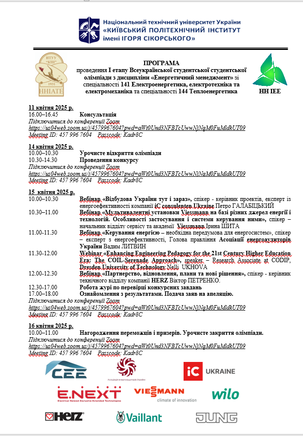 14–16 квітня 2025 — Всеукраїнська студентська олімпіада з дисципліни «Енергетичний менеджмент»