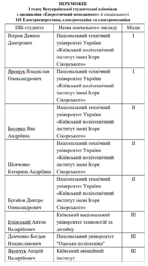 Всеукраїнській студентській олімпіаді з дисципліни «Енергетичний менеджмент»,